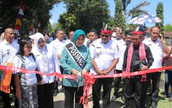 Usai peletakan batu pertama rumah kepala desa Neniari, dilanjutkan dengan pengguntingan pita sebagai tanda diresminya Pagar SD Inpres Neniari oleh Ketua TP-PKK Anita Jais Eli.(**)